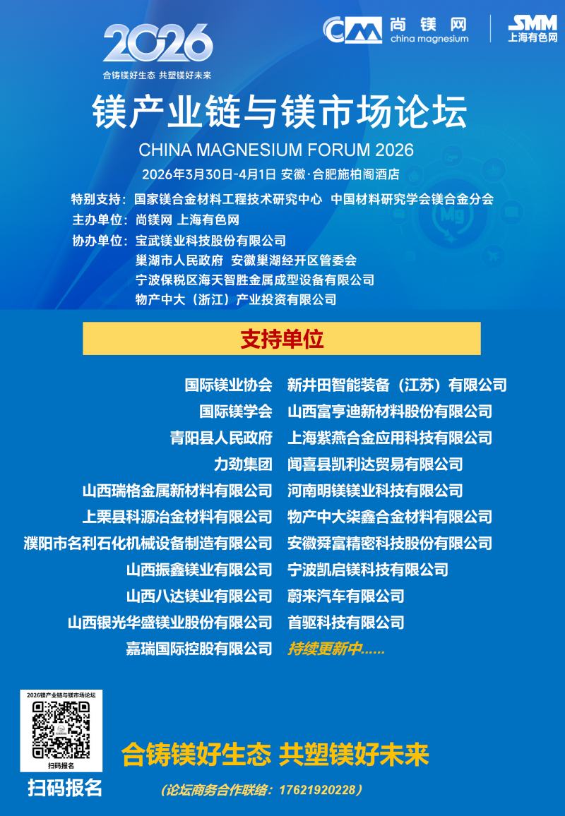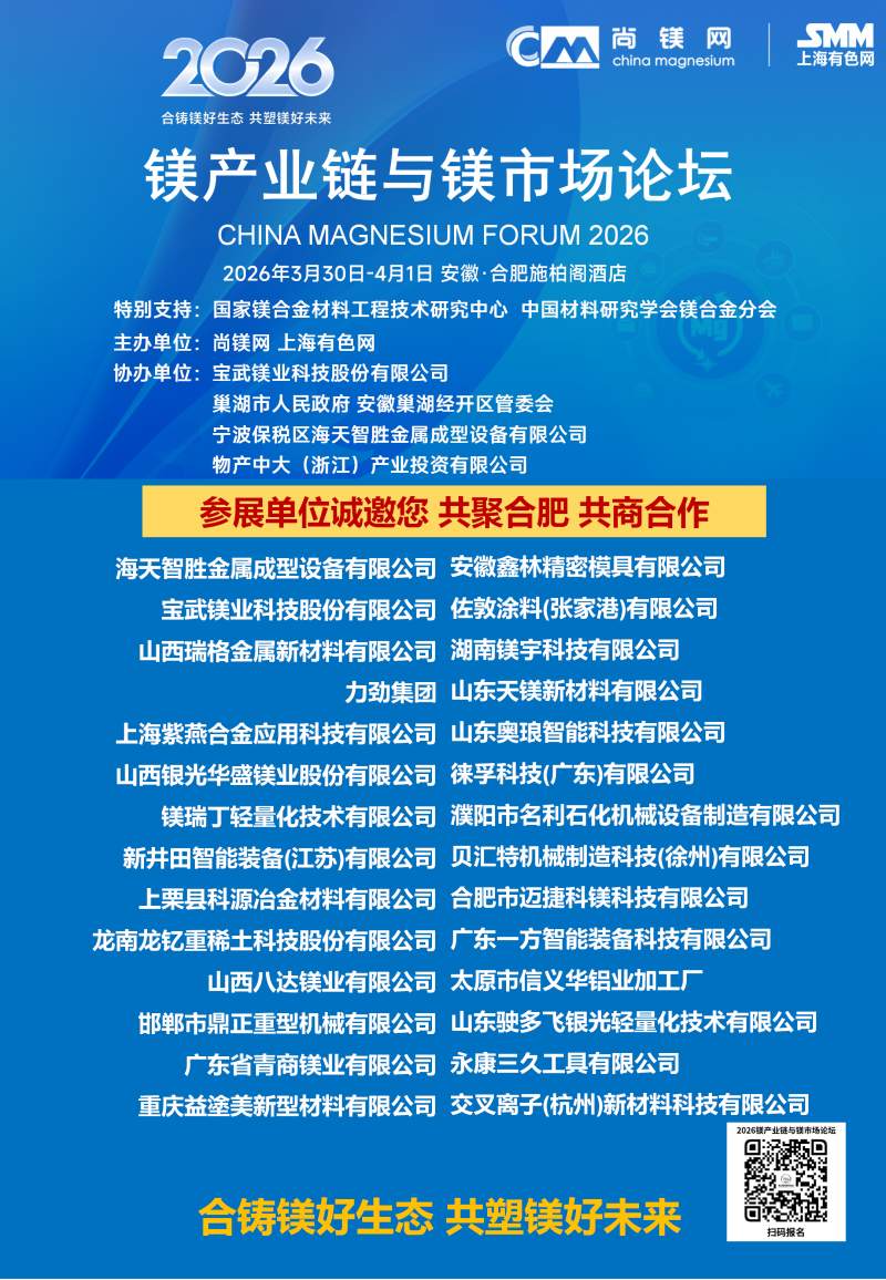 ![]() 2026年的镁行业,正站在供需改善、需求爆发、政策加持的关键拐点,一场属于镁合金的春天正在到来。春光不等人,商机不重来。当下正是布局镁产业链、锁定订单、拓展渠道、升级技术的黄金窗口期。值此时刻,"2026镁产业链与镁市场论坛"将于3月30日-4月1日在合肥市盛大启幕。论坛由国家镁合金材料工程技术研究中心、中国材料研究学会镁合金分会特别支持,尚镁网、上海有色网联合主办,宝武镁业科技股份有限公司、巢湖市人民政府、安徽巢湖经开区管委会、宁波保税区海天智胜金属成型设备有限公司、物产中大(浙江)产业投资有限公司等单位协办,得到了镁产业链众多骨干企业的支持和参与。这将是本论坛连续第四年举行。 本次论坛的主题是:合铸镁好生态,共塑镁好未来。论坛的目的是及时交流镁行业与市场信息,研讨镁制造和应用的前沿科技,为镁产业链企业商业合作、投资合作提供机会,同时,镁产业链各方将借此机会集中展现创新成果,在关键时刻在关键议题上为镁行业发声,营造镁产业良好发展的氛围,共商共议构建新型镁产业生态链,助推镁材料的规模化应用。 本届论坛亮点纷呈:汇聚强大的论坛合作单位,凝聚行业最硬核力量,30家产业链企业及机构鼎力合作搭建镁交流平台。特邀32位有影响力和权威性的专家、企业高管发表致辞和演讲,高密度分享镁研发前沿科技、产业化成果及经验。广泛邀请全产业链相关方深度参与,搭建高效交流平台,目前已有国内领先的镁及镁合金企业、零部件制造企业、30余家整车企业、头部两轮电动车企业、知名3C领域制造商和品牌商、镁产业相关装备、表面处理企业、研发机构、投融资机构确认与会。今年首设镁合金材料和汽车镁合金平行论坛,更深入交流当前镁市场热点。将有55家镁产业链骨干企业集中展示,展现他们的镁合金技术、产品与相关服务。主办方希望借此盛会,助大家见到更大的舞台,望见更高的山峰,直面问题、打开格局、拓宽视野、携手共进。 不负春光,实干兴邦;聚力镁业,共赢未来。让我们以春为序,乘势而上,把镁生意做得更稳、更实、更火,共同开创中国镁产业高质量发展新篇章! 您的参与也将是论坛成功举办的重要方面,期待与您在春暖花开之际,共赴一场“皖镁之约”! 镁业盛典 产业风标 2026镁产业链与镁市场论坛 2026年3月30日—4月1日 安徽·合肥施柏阁酒店