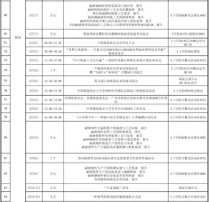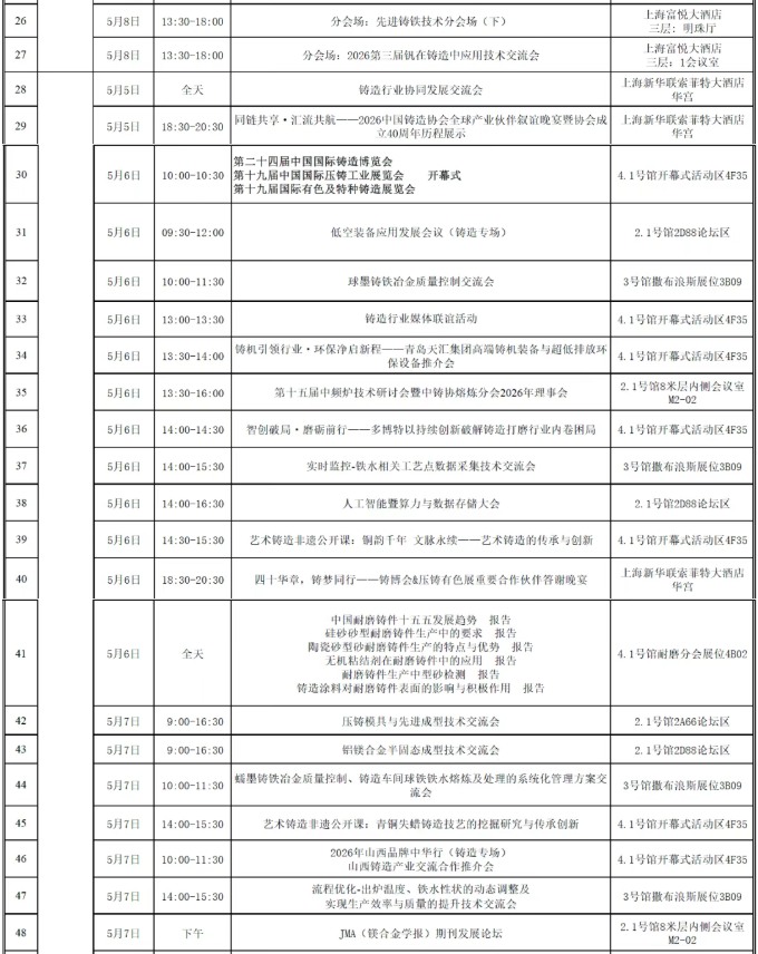 ![]() 第二十四届中国国际铸造博览会、第十九届中国国际压铸工业展览会、第十九届国际有色及特种铸造展览会,将于2026年5月6-9日,在国家会展中心(上海)举办。 本届展会展览面积12万平方米,设4大主题展馆、10大特色展区,以“绿色发展・智向未来”为主题,汇聚1200多家全球领军企业,覆盖铸造全产业链核心环节,呈现沉浸式产业全景,预计将有来自60多个国家和地区的15万人次专业观众及30多个国际买家团共襄盛会。现为您正式揭晓精彩纷呈的同期活动——助您提前规划、精准观展,最大化您的参会价值。