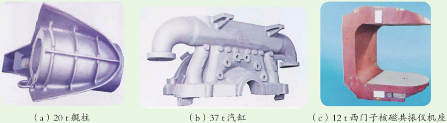 图8 精炼熔炼装备及产品示例 中山市广重铸轧钢有限公司开发使用了钢包电弧加热精炼法、钢液的炉外氩氧脱碳精炼法、真空吹氧脱碳精炼法等先进熔炼工艺。 3. 广东韶铸集团有限公司 广东韶铸集团有限公司以稳定的质量和快速的反应,在国内外客户中享有盛誉,其生产的产品销往全国20多个省市和世界各地,成为国内大型专业铸锻企业。该公司拥有大批先进铸造设备,其中6台电弧炉,最大50t;5条迪砂生产线及多触头高压造型生产线、铸钢静压造型生产线(图9)。集团年产铸钢件7万t、最大单件100t,同时年产铸铁件6万t;产品覆盖发电设备、医疗设备、冶金设备、船舶、工程机械、汽车等多种行业。广东韶铸集团有限公司生产的大型铸件示例如图10所示。