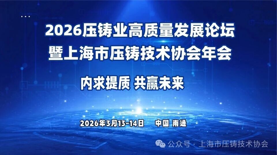 由上海市压铸技术协会主办的“2026 压铸业高质量发展论坛”将于3月13-14日在南通举办。