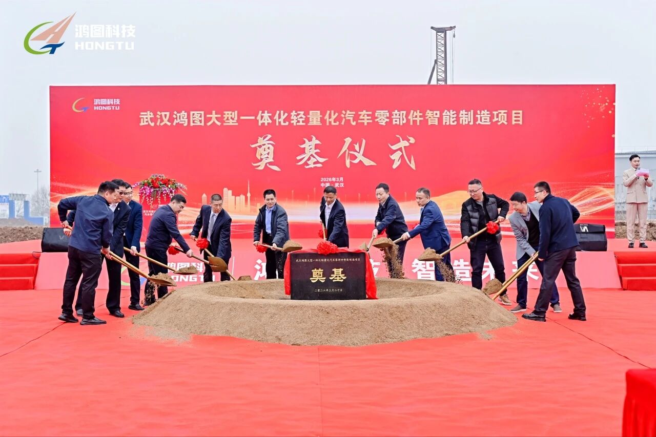 富维股份于2025年3月,经董事会战略决策进军镁合金领域。同年7月,全国首条数字化半固态成型产线落地,具备以850T注射岛为核心的制造加工能力。2026年3月,3600t镁合金半固态注射成型机组调试完成,可实现0.3kg-10kg产品全覆盖。依托全数字化驱动产线,实现了从浆料制备到成型工艺的全流程智能管控。 此外,富维股份协同中国一汽研发总院、富维股份创新研发院、富维安道拓等单位,联合开发镁合金座椅骨架、扶手骨架、仪表板支架等多款产品。全国首套半固态成型工艺镁合金座椅骨架核心部件已完成总成装配,进入主机厂台架验证阶段。该产品将19个钢结构零件集成为4个镁合金零件,替代部分降重达26%。 广东鸿图(武汉)大型一体化压铸汽车部件智造项目奠基动工 3月20日,广东鸿图科技股份有限公司(简称“广东鸿图”)投资建设的广东鸿图(武汉)大型一体化轻量化汽车零部件智能制造项目(简称:广东鸿图武汉二期项目)奠基仪式,在湖北省武汉市江夏区金港新区举行。