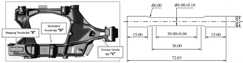 表1 A356铝合金化学成分 wB/% 浇注完成后,对所得不同Mg含量的铸件进行切锯清刺等处理去除加工余量,图1所示为AlSi7Mgx铝合金前副车架的毛坯件。将Mg含量分别为0.28%、0.30%和0.33%的毛坯件各取5件进行表2所示的T6热处理。对热处理后的铸件按照客户要求的位置取样,并通过线切割制备金相试样和标准拉伸试棒,图2所示为取样位置及拉伸试棒尺寸示意图。通过计算3组不同Mg含量铸件的力学性能试验平均值,作为衡量所得铸件力学性能的依据。
