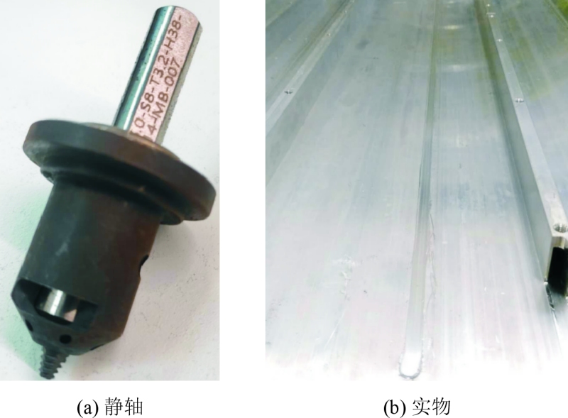 图3 一体化电池托盘产品图 目前搅拌摩擦焊焊具根据轴肩分类,可以分为动轴肩焊具和静轴肩焊具。动轴肩在焊接过程中会随着搅拌头一起旋转,这使得轴肩与被焊接材料之间产生相对运动,通过摩擦生热来促进材料的软化和流动,有助于形成良好的接头。动轴肩能够提供较大的摩擦热输入,有利于提高焊接效率和接头质量。其可以使接头金属材料充分塑化,并且在搅拌作用下,材料的混合和均匀性较好,能够减少接头中的缺陷。图4为动轴肩焊具和焊缝实物图。 静轴肩搅拌摩擦焊采用轴肩与搅拌针分体式设计,在焊接过程中内部搅拌针转动,而外部轴肩不转动,仅沿焊接方向行进。图5为静轴肩焊具和焊接实物图。由于轴肩不转动,表面热输入减小,工件厚度方向热量分布相对较均匀;接头摩擦热量分布较为均匀,组织均匀性好,接头表面光洁,飞边量小。此外,静轴肩能够有效抑制接头材料挤出,减少接头减薄,可实现角接头结构,降低孔洞、隧道等缺陷的形成几率,接头性能优良。
