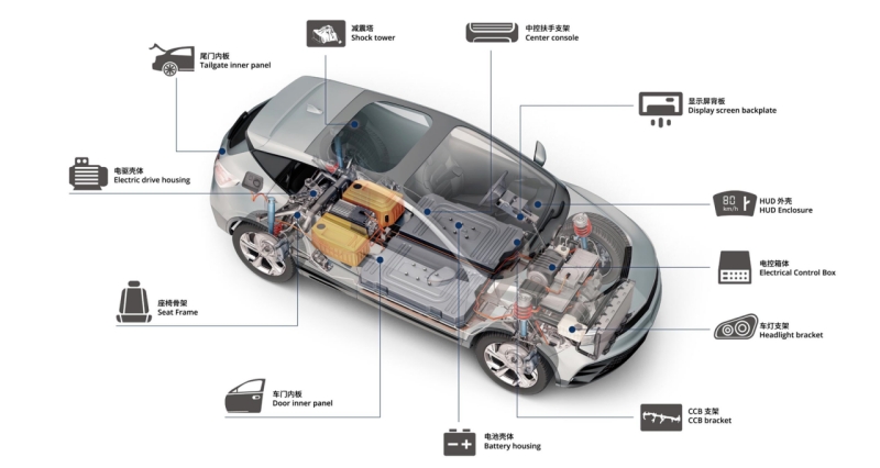 典型汽车领域产品: 1、屏幕背板:采用镁合金注射成型,拥有更好的内部质量、尺寸精度、以及轻量化效果。工艺范围覆盖单屏、双联屏以及贯穿式超长屏等全品类。 2、CCB仪表盘支架:全球多家OEM厂商采用轻量化一体结构,重量3.6-4.8kg,较传统钢制件减重约3kg,镁合金注射工艺带来更高的尺寸精度,同时满足多功能安装需求。 3、尾门内板:可通过超大型镁合金双注射成型技术集成几十个零件,减少繁杂工序,预计减重超过20%。