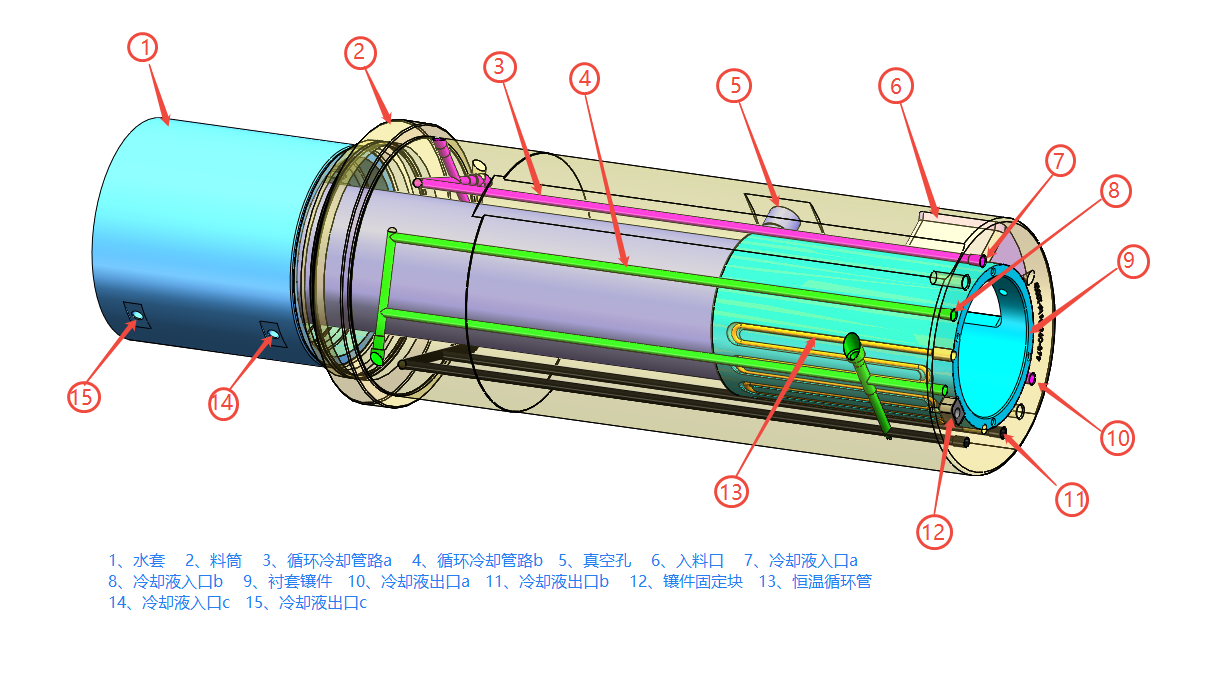 创新技术:一种具有智能控温的压射室防腐蚀的料筒 申报企业:宁波皓丽金属有限公司 创新背景 随着一体化压铸技术的发展,铝合金压铸模具呈现出集成化、大型化趋势。为应对大型定量炉对压射室的冲击,压射室配件在材料强度、抗疲劳性能等方面提出了更高要求,这种技术革新推动了新型压射室配件技术的应运而生。