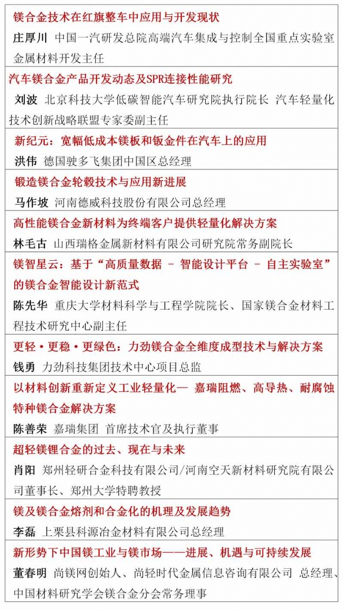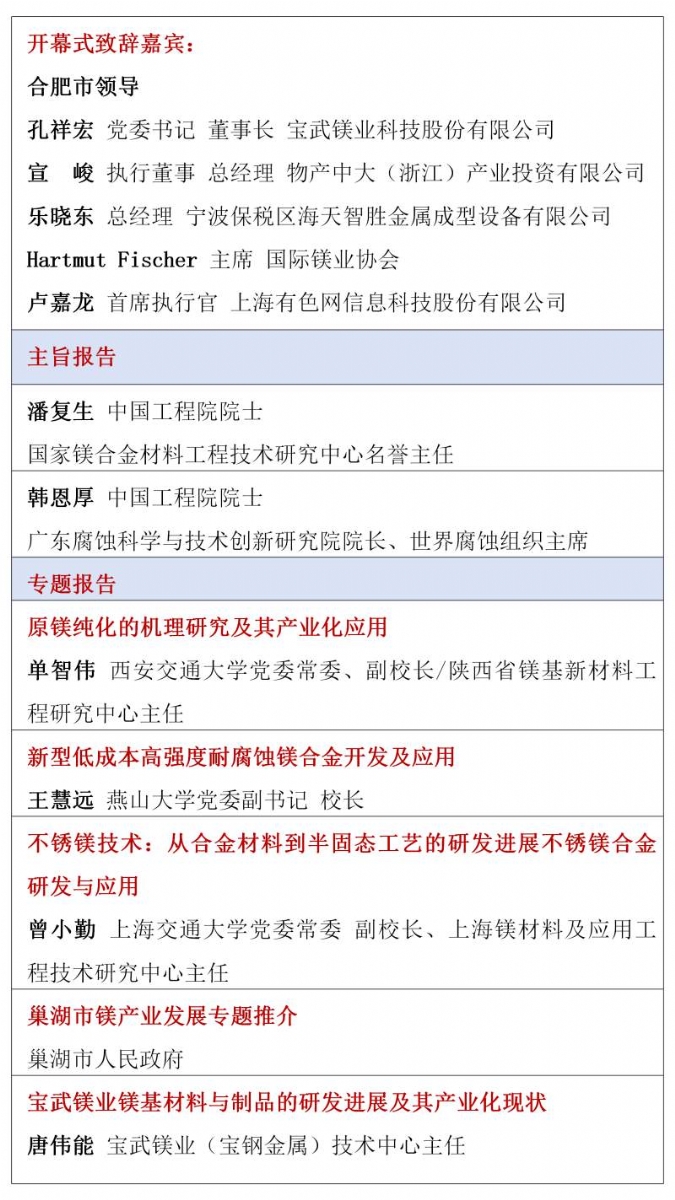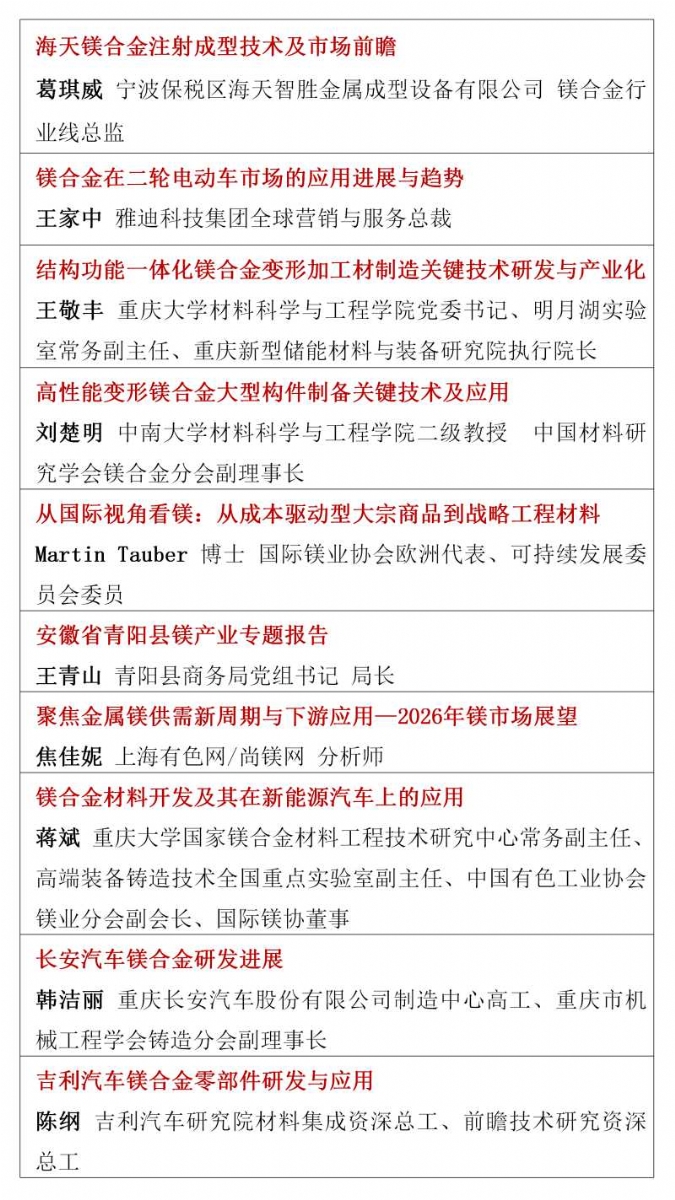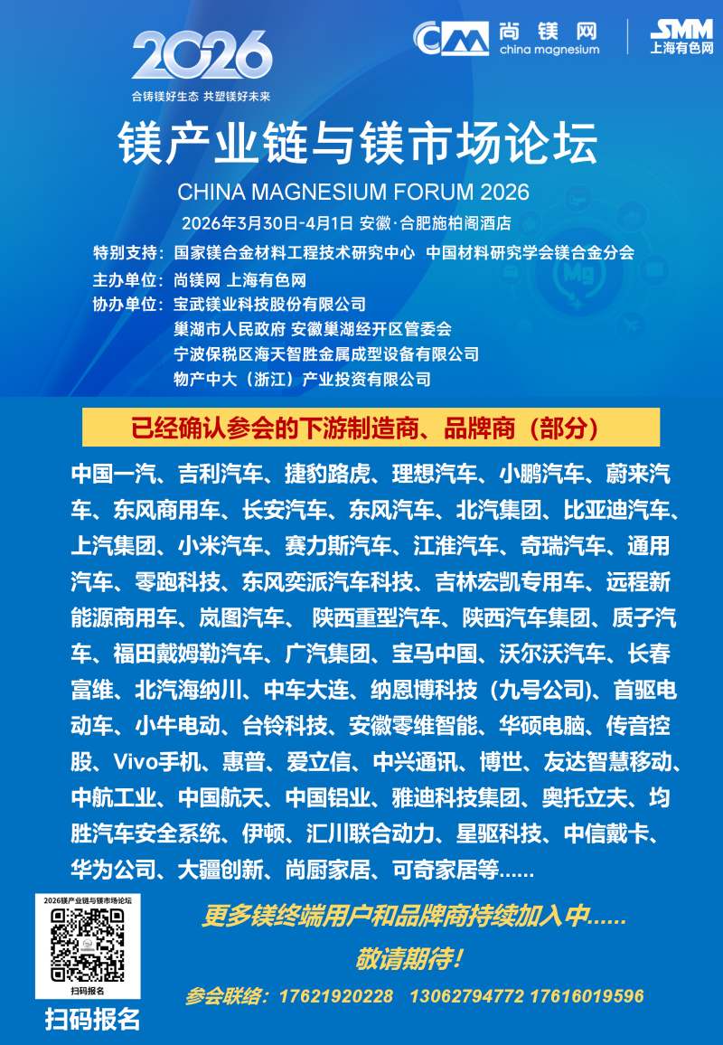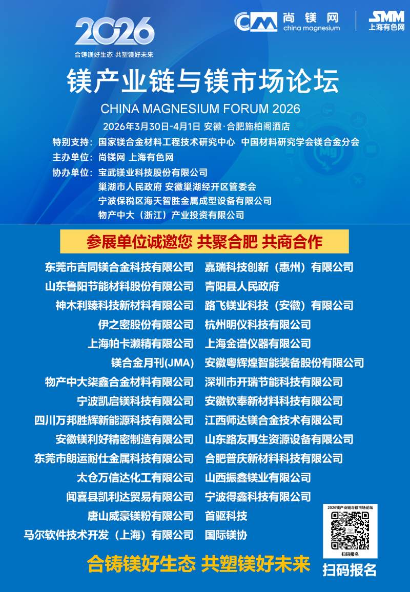 ![]() 2026年的镁行业,正站在供需改善、需求爆发、政策加持的关键拐点,一场属于镁合金的春天正在到来。春光不等人,商机不重来。当下正是布局镁产业链、锁定订单、拓展渠道、升级技术的黄金窗口期。值此时刻,"2026镁产业链与镁市场论坛"将于3月30日-4月1日在合肥市盛大启幕。论坛由国家镁合金材料工程技术研究中心、中国材料研究学会镁合金分会特别支持,尚镁网、上海有色网联合主办,宝武镁业科技股份有限公司、巢湖市人民政府、安徽巢湖经开区管委会、宁波保税区海天智胜金属成型设备有限公司、物产中大(浙江)产业投资有限公司等单位协办,得到了镁产业链众多骨干企业的支持和参与。这将是本论坛连续第四年举行。 本次论坛的主题是:合铸镁好生态,共塑镁好未来。论坛的目的是及时交流镁行业与市场信息,研讨镁制造和应用的前沿科技,为镁产业链企业商业合作、投资合作提供机会,同时,镁产业链各方将借此机会集中展现创新成果,在关键时刻在关键议题上为镁行业发声,营造镁产业良好发展的氛围,共商共议构建新型镁产业生态链,助推镁材料的规模化应用。 本届论坛亮点纷呈:汇聚强大的论坛合作单位,凝聚行业最硬核力量,30家产业链企业及机构鼎力合作搭建镁交流平台。特邀32位有影响力和权威性的专家、企业高管发表致辞和演讲,高密度分享镁研发前沿科技、产业化成果及经验。广泛邀请全产业链相关方深度参与,搭建高效交流平台,目前已有国内领先的镁及镁合金企业、零部件制造企业、30余家整车企业、头部两轮电动车企业、知名3C领域制造商和品牌商、镁产业相关装备、表面处理企业、研发机构、投融资机构确认与会。今年首设镁合金材料和汽车镁合金平行论坛,更深入交流当前镁市场热点。将有55家镁产业链骨干企业集中展示,展现他们的镁合金技术、产品与相关服务。主办方希望借此盛会,助大家见到更大的舞台,望见更高的山峰,直面问题、打开格局、拓宽视野、携手共进。 不负春光,实干兴邦;聚力镁业,共赢未来。让我们以春为序,乘势而上,把镁生意做得更稳、更实、更火,共同开创中国镁产业高质量发展新篇章! 您的参与也将是论坛成功举办的重要方面,期待与您在春暖花开之际,共赴一场“皖镁之约”! 镁业盛典 产业风标 2026镁产业链与镁市场论坛 2026年3月30日—4月1日 安徽·合肥施柏阁酒店