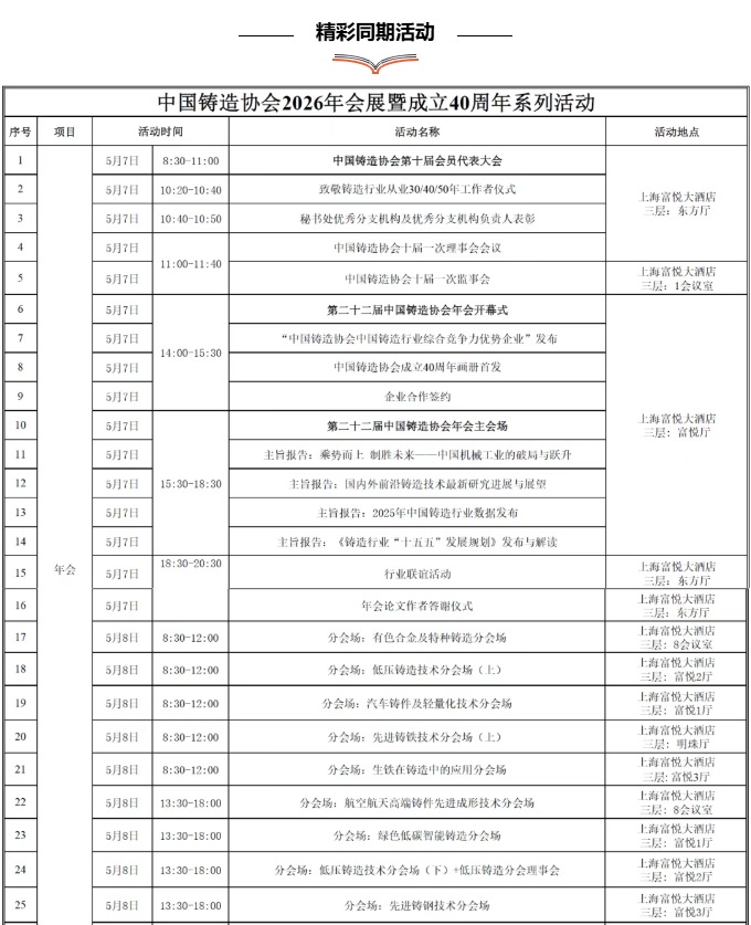 ![]() 第二十四届中国国际铸造博览会、第十九届中国国际压铸工业展览会、第十九届国际有色及特种铸造展览会,将于2026年5月6-9日,在国家会展中心(上海)举办。 本届展会展览面积12万平方米,设4大主题展馆、10大特色展区,以“绿色发展・智向未来”为主题,汇聚1200多家全球领军企业,覆盖铸造全产业链核心环节,呈现沉浸式产业全景,预计将有来自60多个国家和地区的15万人次专业观众及30多个国际买家团共襄盛会。现为您正式揭晓精彩纷呈的同期活动——助您提前规划、精准观展,最大化您的参会价值。