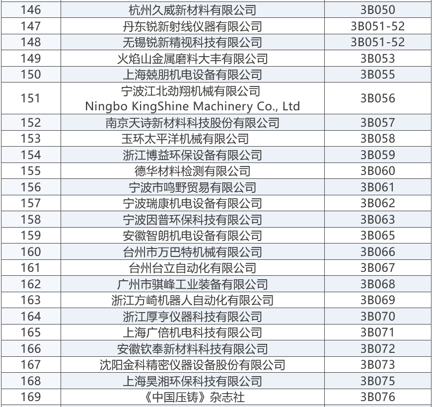 上届展会部分参展商 “2025宁波国际铸造锻造及压铸工业展览会”将成为浙江地区铸造与压铸行业的一大盛事,为铸造、锻造及压铸行业的交流与合作搭建起一座重要的桥梁。与此同时,宁波国际金属冶金工业展览会,将与“2025宁波国际铸造及压铸展”同期举办,可形成资源共享、相得益彰之势。 展商名录